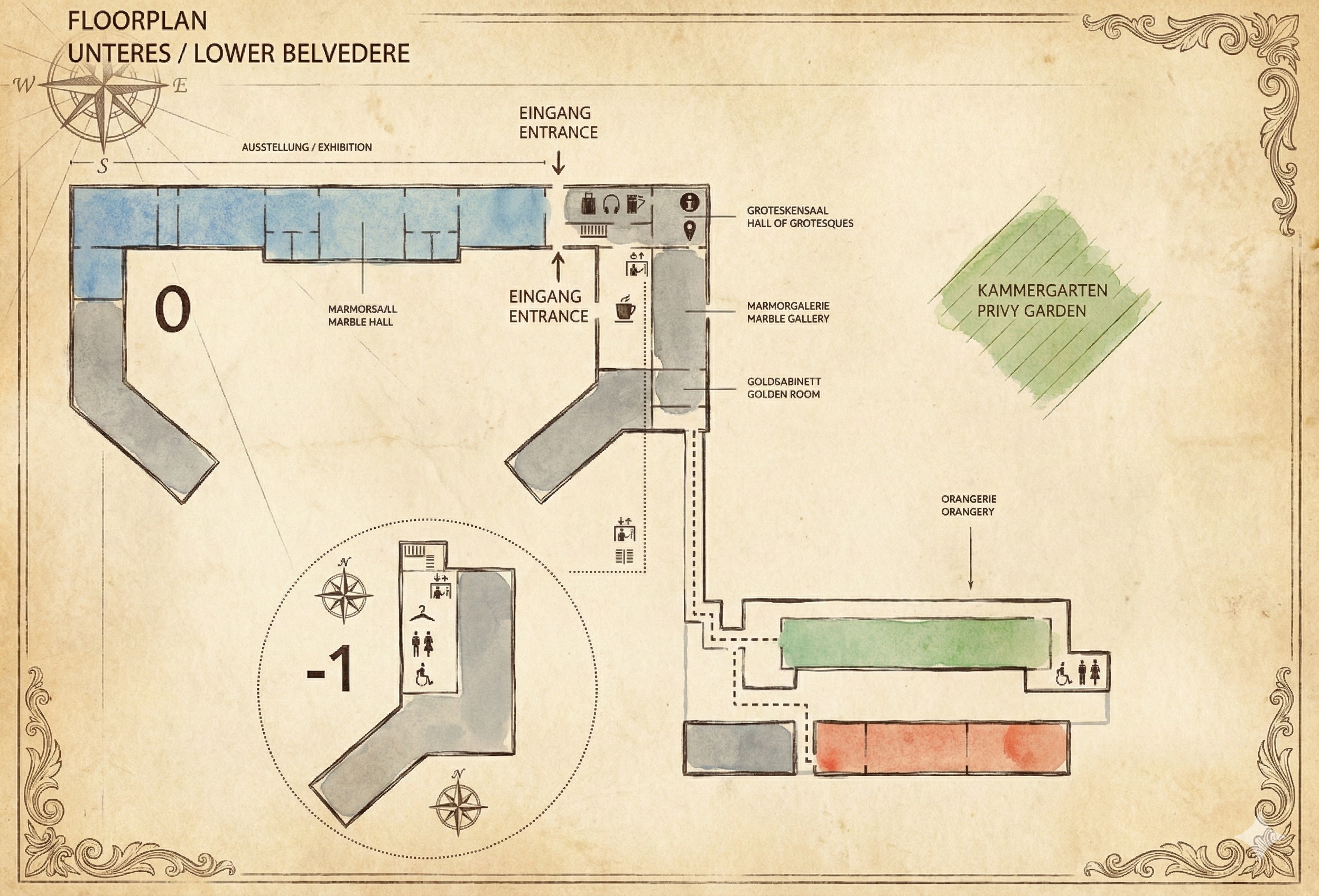 Navigate the former residential palace of Prince Eugene. This plan helps you find the Marble Hall, the Grotesque Hall, and the special exhibition rooms in the Orangery.