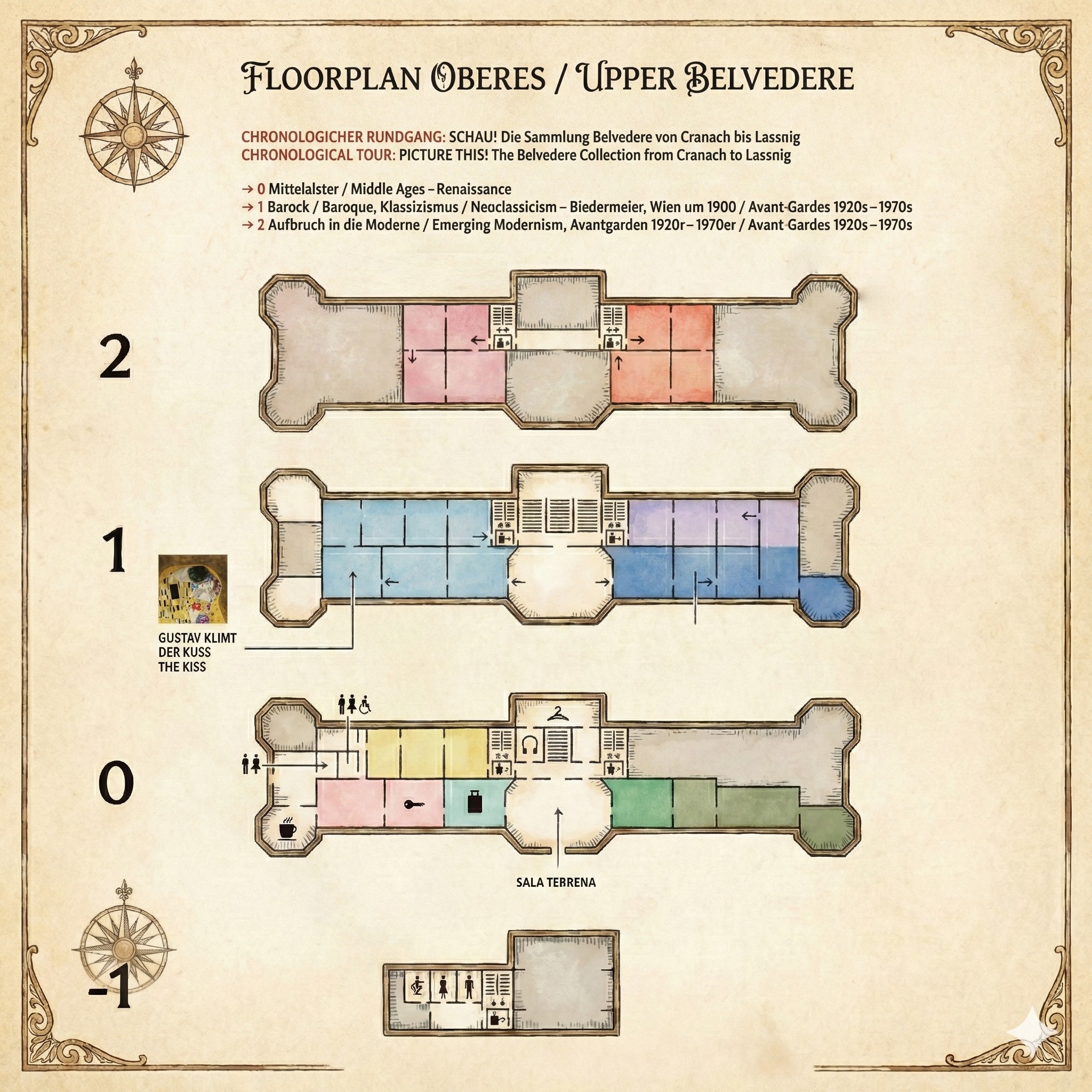 Navigate your way through the Belvedere complex. This map includes the Upper and Lower Belvedere, Belvedere 21, the gardens, and all accessible entrances.